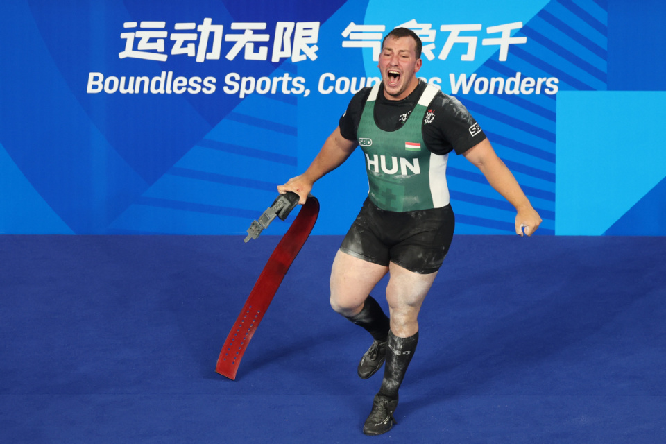 利来w66最给利的老牌匈牙利选手Budai Kristof庆祝试举成功。中国日报记者 魏晓昊 摄